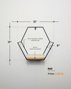 Description: Add a modern touch to your space with the Noir Wall Decor Shelf- CRV- WD001  wall shelf. Featuring a unique geometric design, it measures 12″ in width and 12″ in height, with a depth of 6″. The shelf is built with durable 12mm melamine boards and a sturdy 6mm powder-coated solid MS bar frame. Ideal for displaying decor or organizing essentials, this stylish piece blends function with minimal elegance.